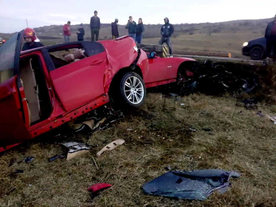 BMW RUPT ÎN DOUĂ. Șoferul a scăpat ca prin minune și a păzit epava mașinii, de frică să nu-i fie furată