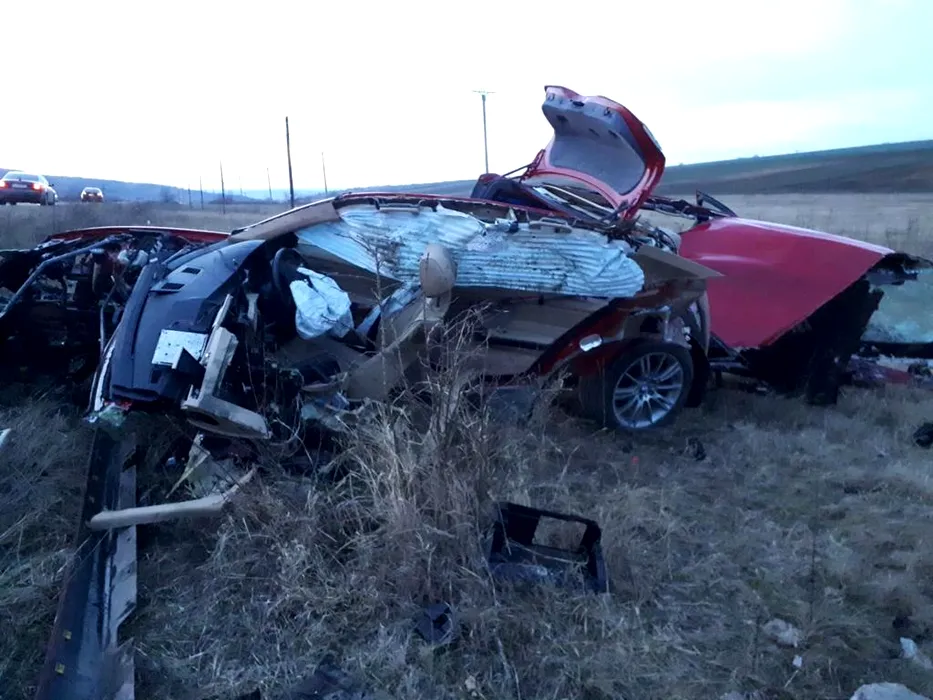 BMW RUPT ÎN DOUĂ. Șoferul a scăpat ca prin minune și a păzit epava mașinii, de frică să nu-i fie furată