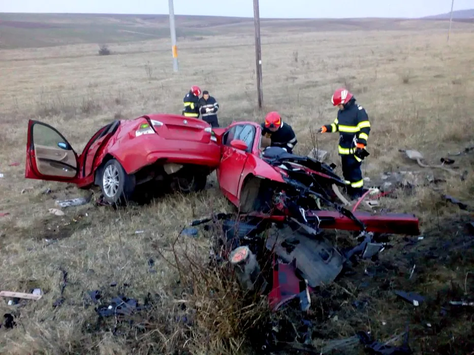 BMW RUPT ÎN DOUĂ. Șoferul a scăpat ca prin minune și a păzit epava mașinii, de frică să nu-i fie furată