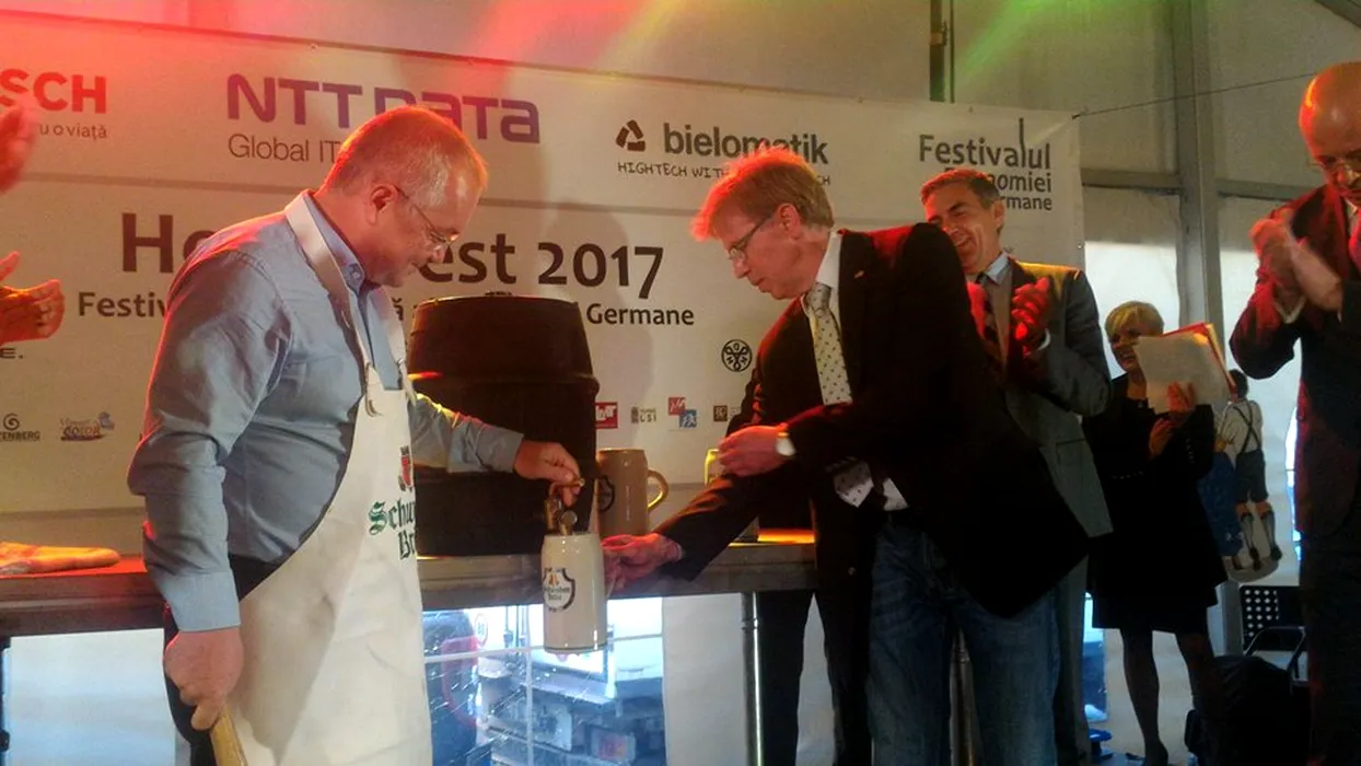 Boc a dat cep unui butoi cu bere germană și a ciocnit o halbă cu ambasadorul Germaniei. FOTO