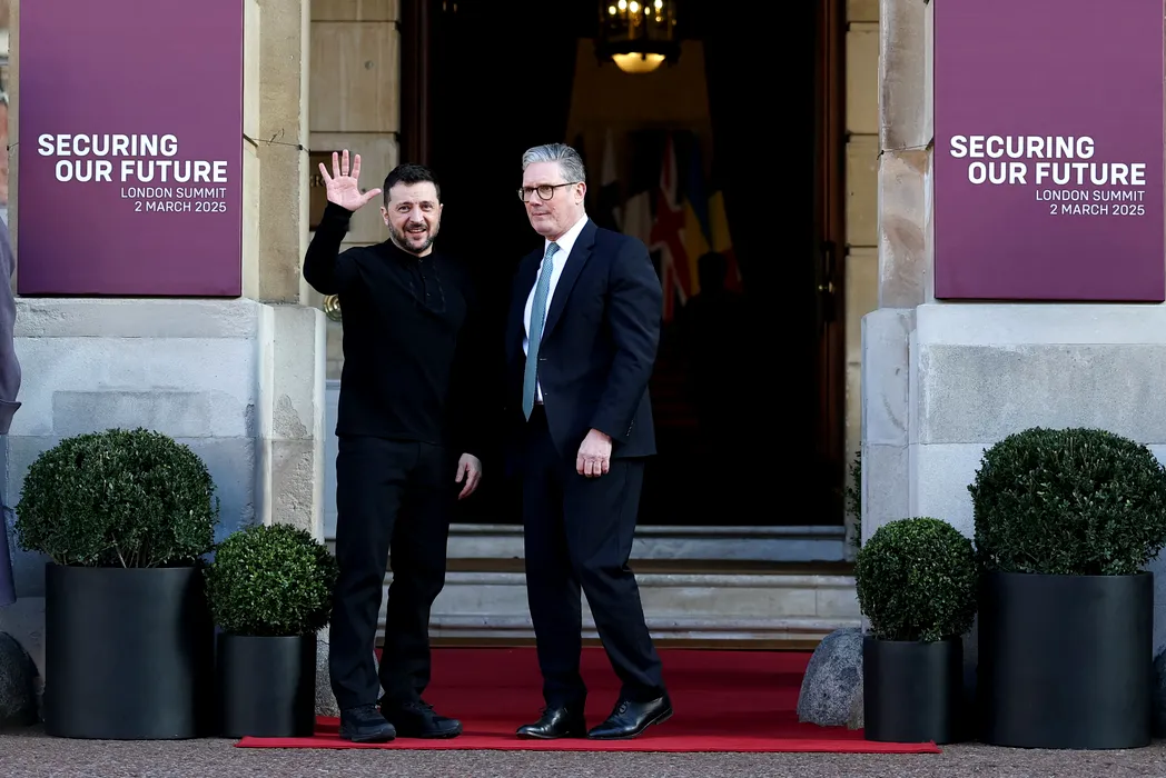 02 March 2025, United Kingdom, London: UK Prime Minister Sir Keir Starmer (R) welcomes Ukrainian President Volodymyr Zelensky to Lancaster House, for a European leaders' summit on the situation in Ukraine. Photo: Toby Melville/PA Wire/dpa