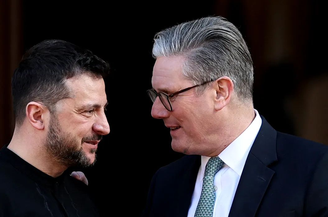 02 March 2025, United Kingdom, London: UK Prime Minister Sir Keir Starmer (R) welcomes Ukrainian President Volodymyr Zelensky to Lancaster House, for a European leaders' summit on the situation in Ukraine. Photo: Toby Melville/PA Wire/dpa