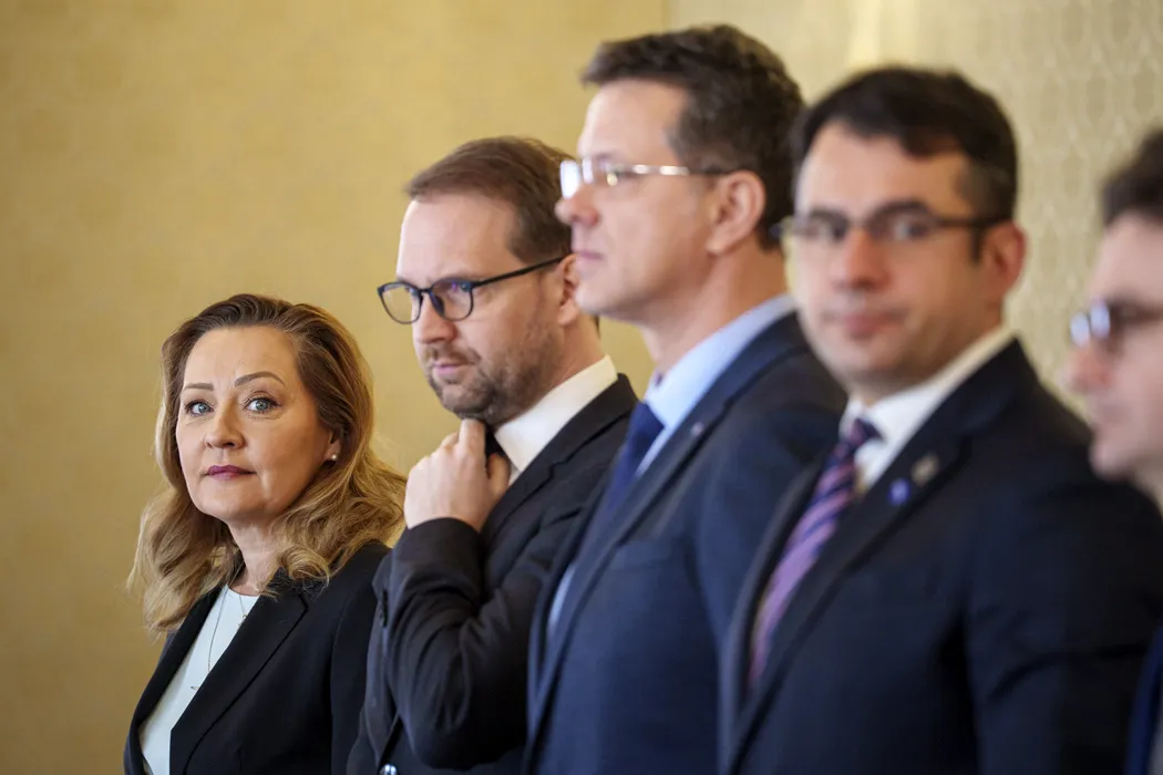 Delegatia Uniunii Salvati Romania (USR) formata din Elena Lasconi, Dominic Fritz, Ionut Mosteanu si Stefan Palarie, asteapta inaintea unor consultari cu presedintele interimar al Romaniei, Ilie Bolojan, la Palatul Cotroceni din Bucuresti, miercuri, 26 februarie 2025. ANDREEA ALEXANDRU / MEDIAFAX FOTO