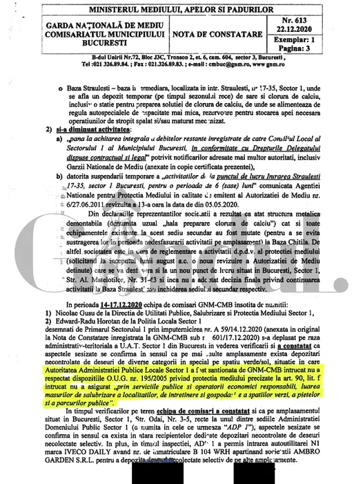 Întinsă pe 5 pagini, nota de constatare a Gărzii Naționale de Mediu arată negru pe alb faptul că firma de salubrizare Romprest s-a achitat de obligațiile contractuale, iar primarița Clotilde Armand este vinovată de faptul că gunoaiele au invadat Sectorul 1