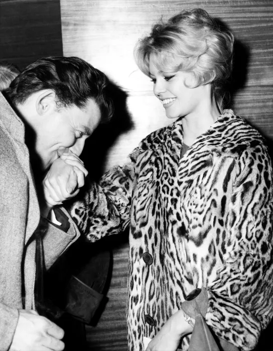 Brigitte Bardot receives an old-fashioned style kiss from actor Gerald Philippe. They were attending the premiere of the movie ‘Montparnasse 19‘ in Paris. She is wearing a Leopard skin coat. Later as an animal rights activist, she wrote, 'wearing a fur is wearing a cemetery on your back.' - (CSU_2015_6_219),Image: 257437196, License: Rights-managed, Restrictions: For usage credit please use;, Model Release: no, Credit line: - / Everett / Profimedia