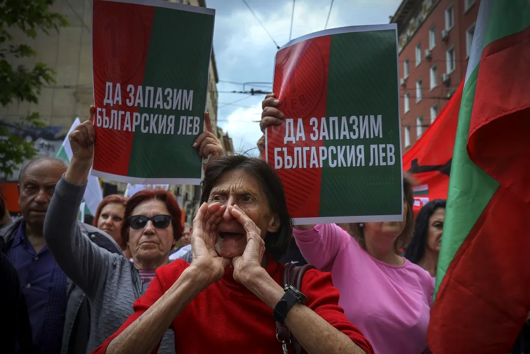 Protestatari strigă sloganuri anti-euro, și pancarte pe care scrie "Păstrați leva bulgară!" în timpul unui protest anti-euro din Sofia, Bulgaria, sâmbătă, 31 mai 2025.