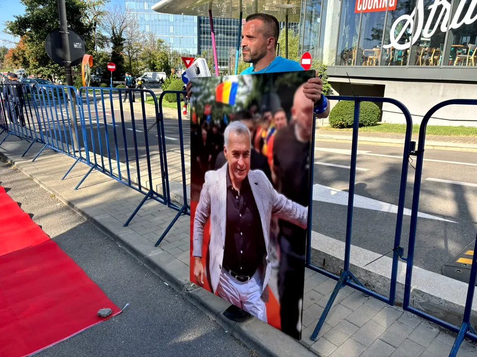 Călin Georgescu la control judiciar, pe covorul roșu. Un susținător este cercetat că a arborat un steag cu însemnele Mișcării Legionare