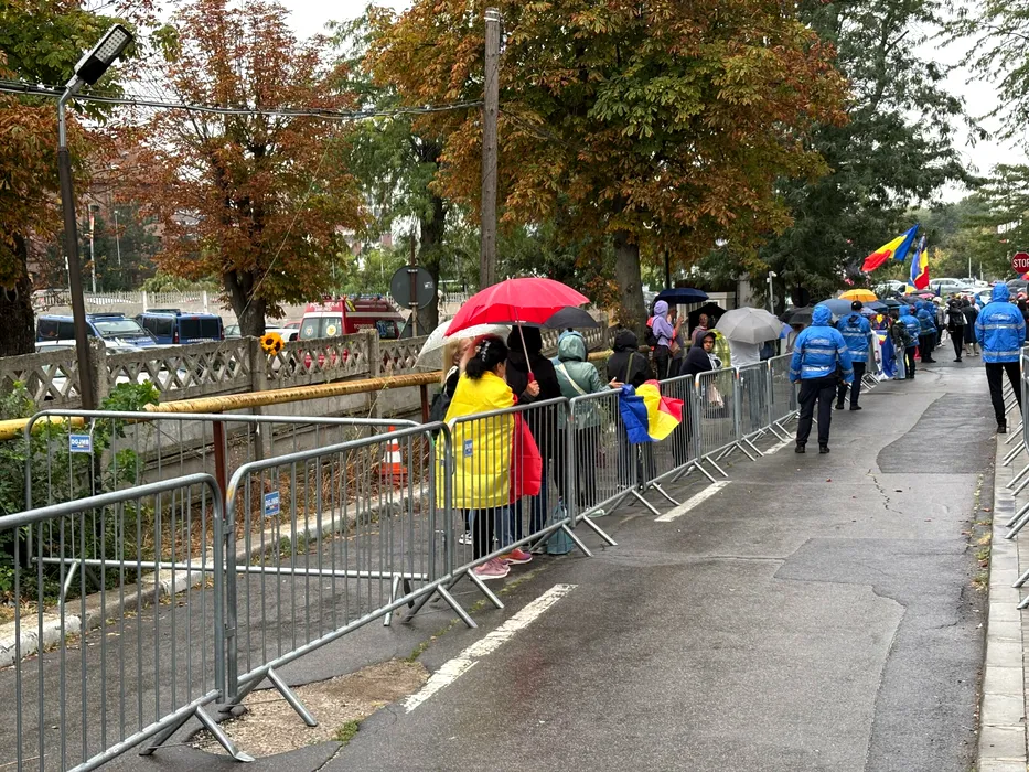 Călin GEORGESCU, așteptat de peste 100 de oameni în fața Poliției Ilfov cu drapel și pancarte: „Vocea adevărului, vocea demnității”
