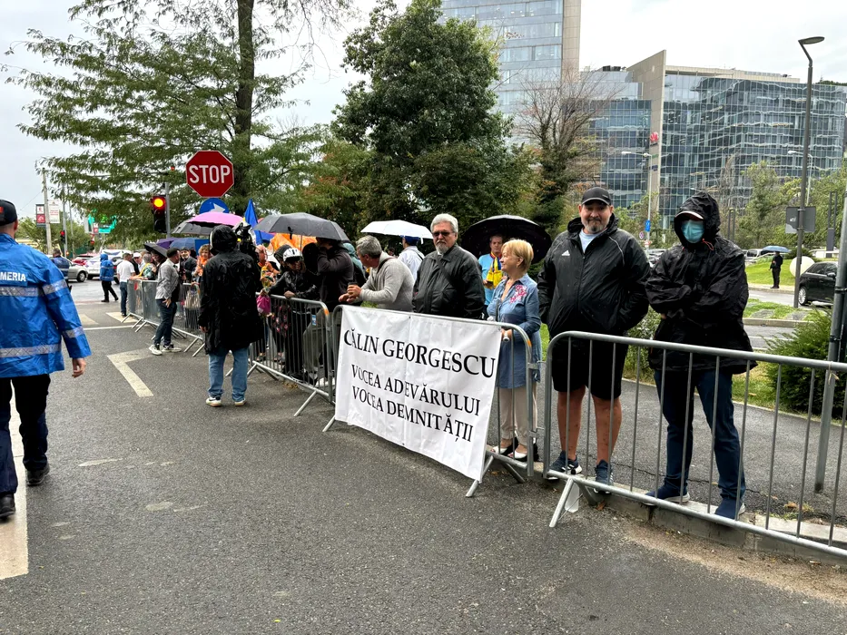 Călin GEORGESCU, așteptat de peste 100 de oameni în fața Poliției Ilfov cu drapel și pancarte: „Vocea adevărului, vocea demnității”