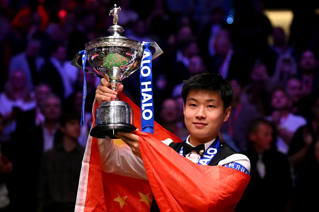 TOPSHOT - China's Zhao Xintong poses with the trophy after victory over Wales' Mark Williams in the World Championship Snooker final at The Crucible in Sheffield, northern England on May 5, 2025. Zhao Xintong became the first Chinese player to win the World Snooker Championship as the qualifier completed his stunning march to the title with a 18-12 victory against Mark Williams in the final on Monday. (Photo by Oli SCARFF / AFP) (Photo by OLI SCARFF/AFP via Getty Images)