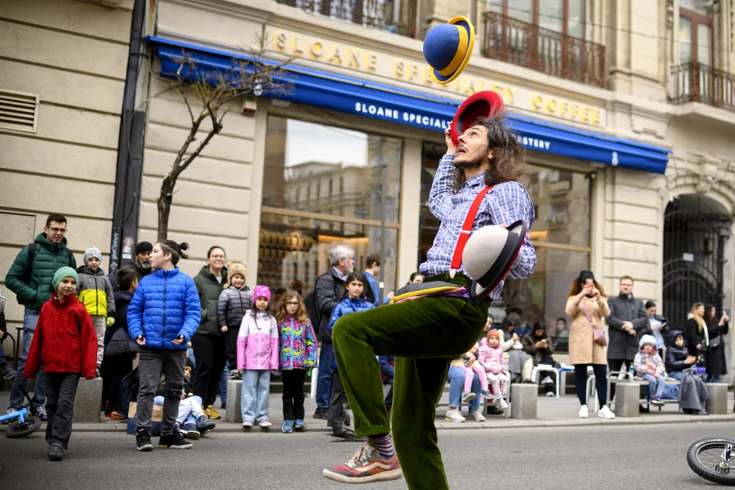 Un tanar jongleaza in timpul evenimentului „Strazi deschise – Bucuresti, Promenada urbana”, in Bucuresti, sambata 12 aprilie 2025. ALEXANDRU DOBRE / MEDIAFAX FOTO.