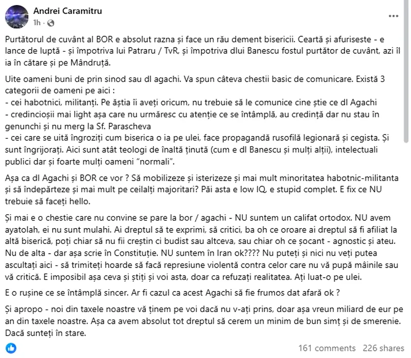 Caramitru cere demiterea purtătorului de cuvânt al BOR: „Nu suntem Iran, OK?”