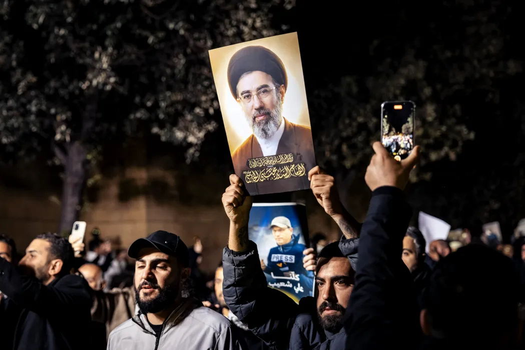 A demonstrator holds a picture of Ayatollah Mojtaba Khamenei, Iran’s new supreme leader, during a protest at Martyrs’ Square in central Beirut, Lebanon, on March 28, 2026, following the killing of three journalists. Demonstrators raised posters condemning the killings after an Israeli strike killed Ali Shaib of Al Manar and Fatima Ftouni of Al Mayadeen, along with her brother Mohammed Ftouni, in southern Lebanon, prompting renewed calls for the protection of journalists in conflict zones. Photo by Jonathan Labusch/Middle East Images/ABACAPRESS.COM