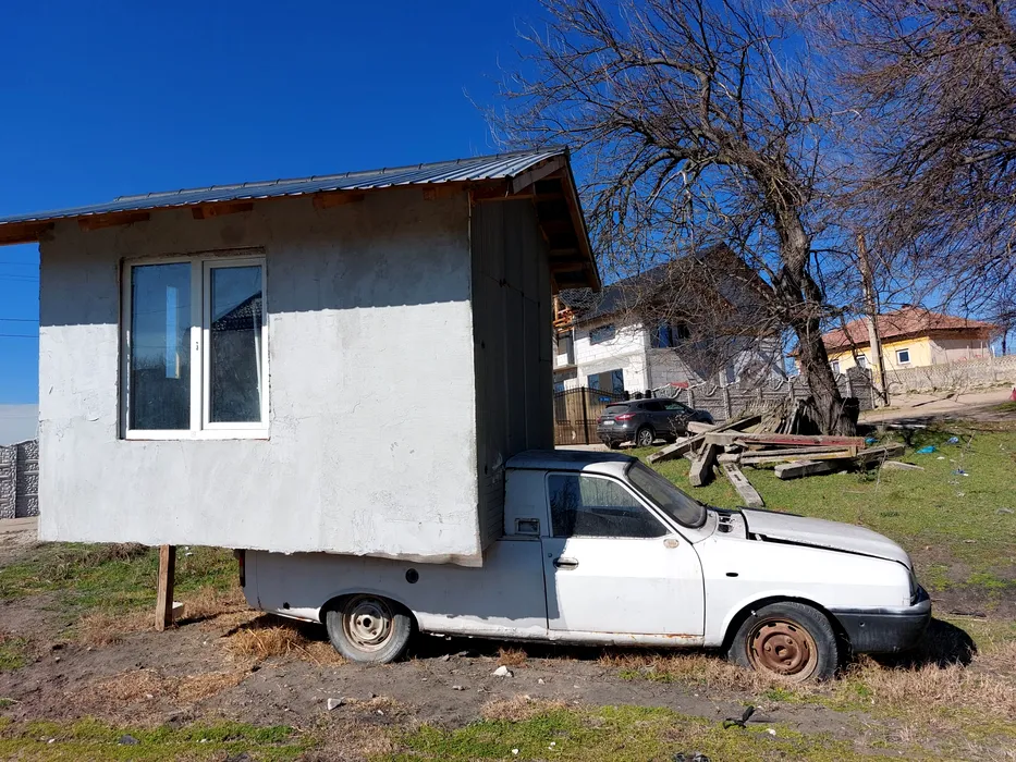 FOTO | Și-au făcut iarna car! De frica hoților, oltenii au inventat casa pe roți pentru paza recoltelor