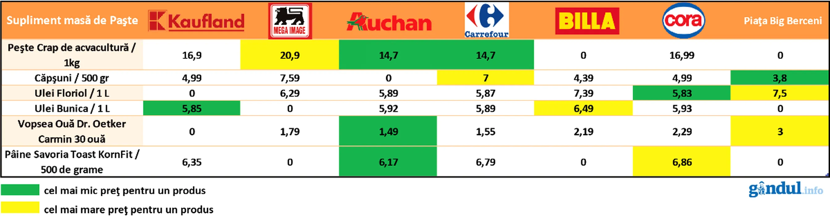 Cât costă ACELAȘI COȘ DE PRODUSE la Carrefour, Kaufland, Cora, Auchan, Billa și Mega Image, după scumpirile de la 1 aprilie