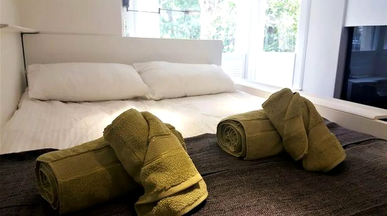 Cât costă chiria într-o garsonieră în care nu poate locui decât o singură persoană. Patul e suspendat deasupra canapelei, din cauza spațiului îngust
