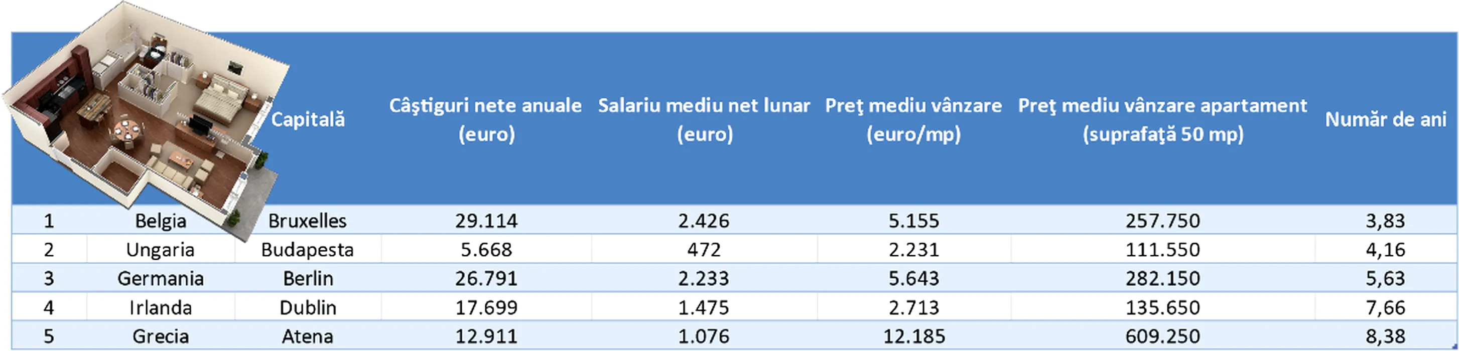 Câți ani trebuie să muncească un român, un ungur sau un francez pentru a-și cumpăra un apartament de 50 de metri pătrați în capitală