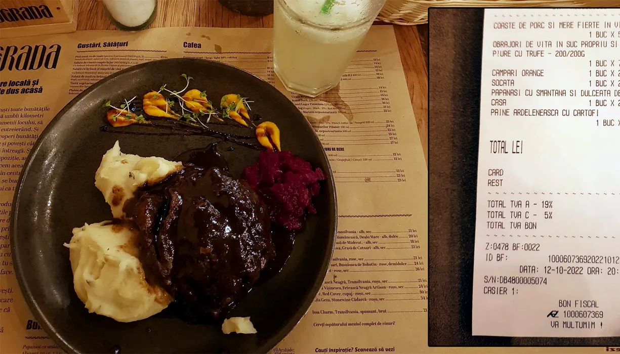 Avem nota de plată! Câți lei a dat o turistă pe o porție de obrăjori de vițel, într-un restaurant din Brașov