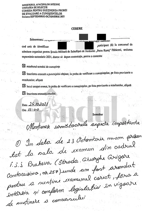 EXCLUSIV | Ce a scris în contestație unul dintre candidații la examenul Jandarmeriei, unde notele de 2 și 3 au fost transformate în 10