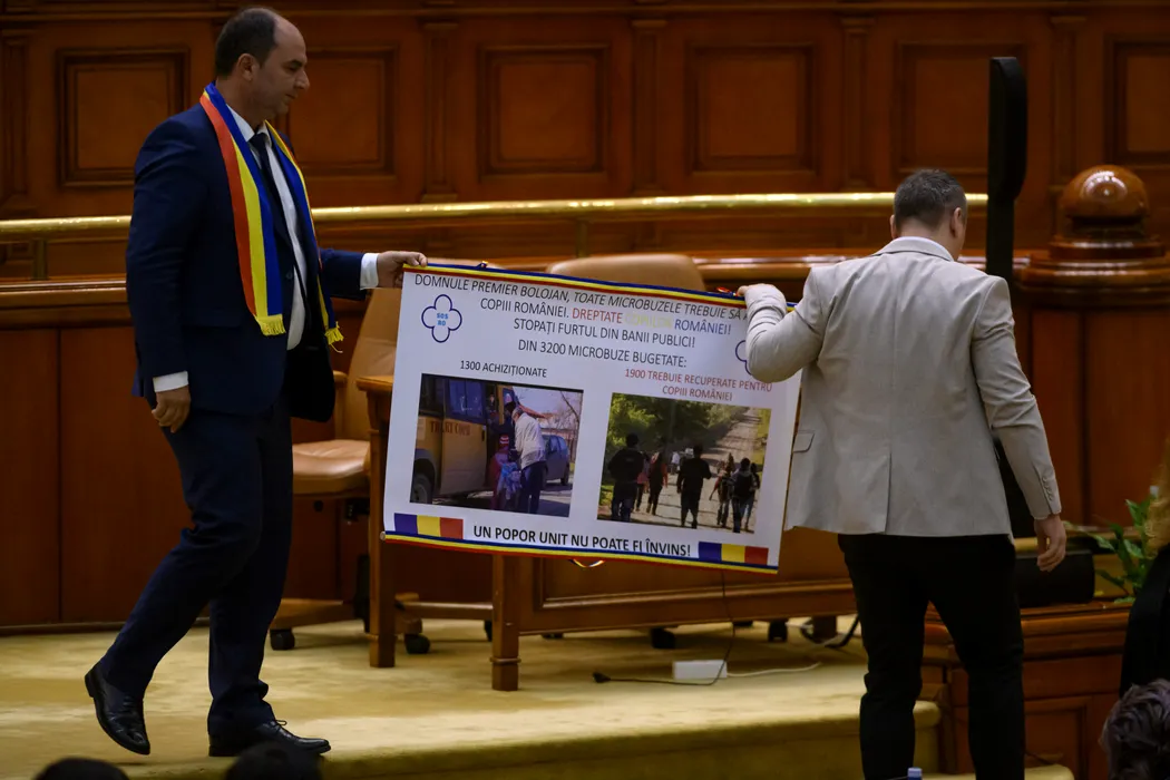 Doi parlamentari tin o pancarta in timpul sedintei comune a Senatului si Camerei Deputatilor pentru dezbaterea celor patru motiuni de cenzura depuse de AUR, S.O.S. Romania si POT la adresa Guvernului, dupa angajarea raspunderii pe cinci proiecte de lege ce cuprind masurile din pachetul doi de reforma, duminica, 7 septembrie 2025, la Palatul Parlamentului din Bucuresti. ALEXANDRU DOBRE / MEDIAFAX FOTO