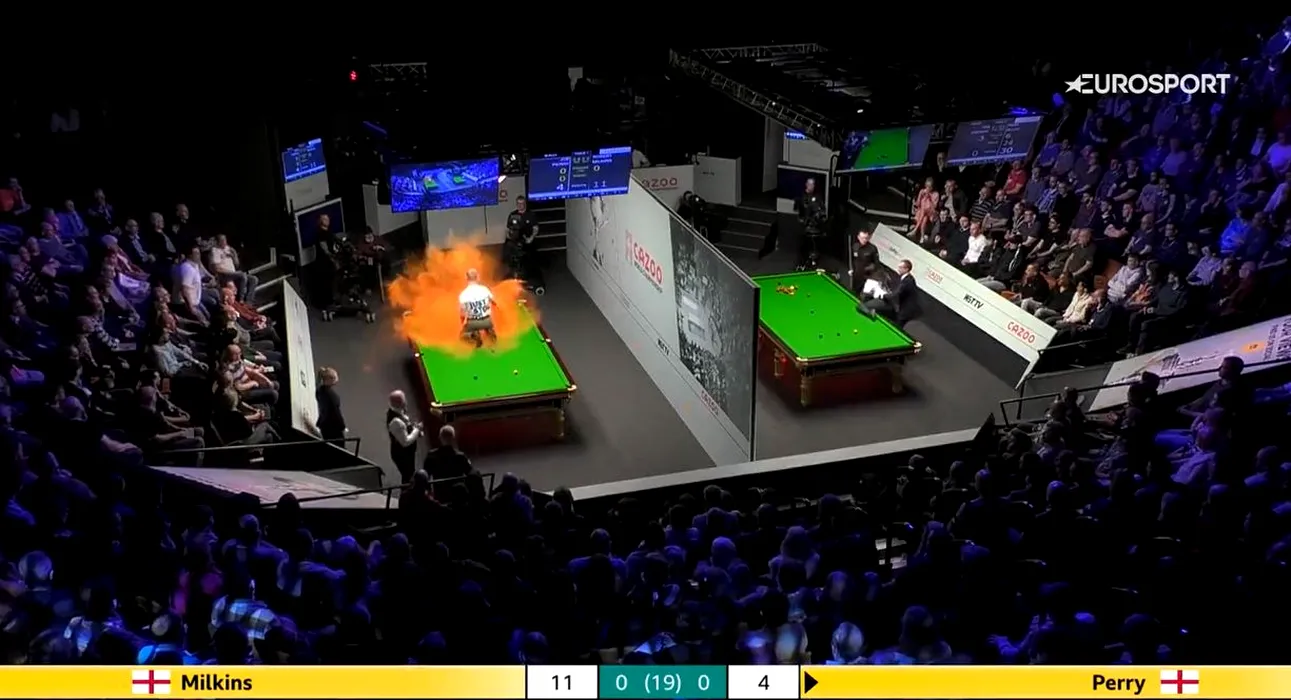 Ce s-a întâmplat la Campionatul Mondial de SNOOKER depășește orice imaginație! Un protestatar a distrus masa de joc cu un praf portocaliu! VIDEO
