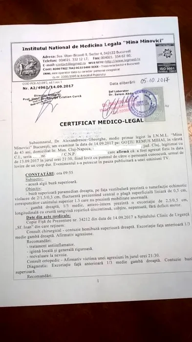 Ce scrie pe certificatul medico-legal al lui Goțiu, după bătaia cu Palada. „Nu-mi voi retrage plângerea penală”