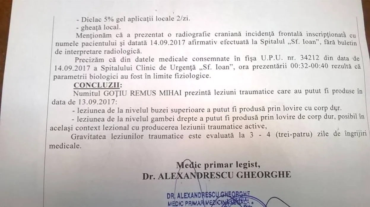 Ce scrie pe certificatul medico-legal al lui Goțiu, după bătaia cu Palada. „Nu-mi voi retrage plângerea penală”