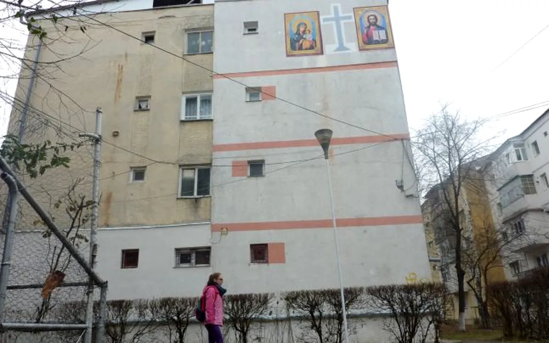 Ce și-a pictat un botoșănean, venit de la muncă din Olanda, pe peretele exterior al garsonierei. „Oamenii care trec pe aici își fac cruce”