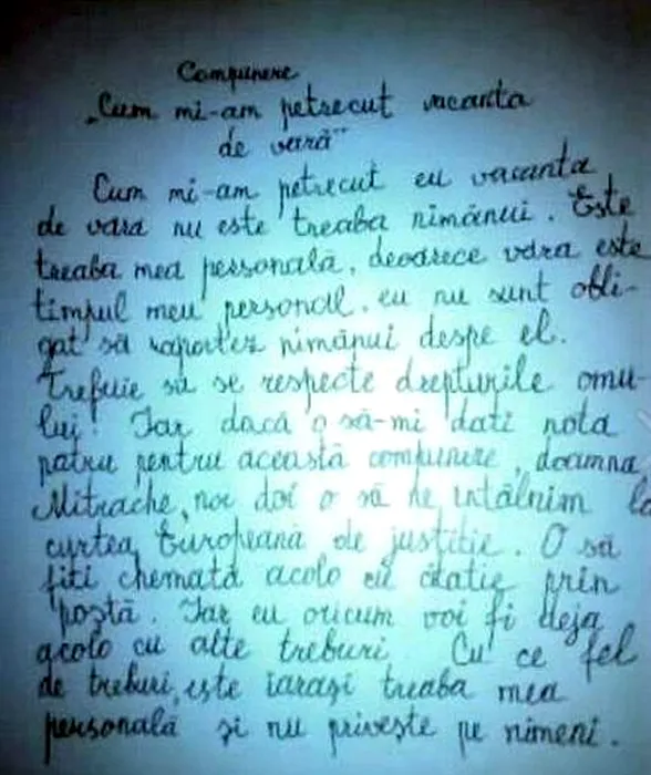 Cea mai originală compunere despre vacanța de vară: „E treaba mea! Dacă îmi dați patru, vă chem la Curtea Europeană de Justiție!”. FOTO