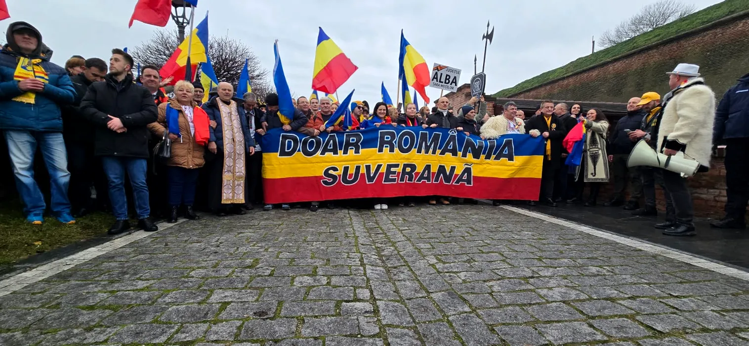 Cei de la AUR, alături de sute de simpatizanţi, îl așteaptă pe Calin Georgescu la Monumentul Unirii din Alba Iulia, de 1 Decembrie