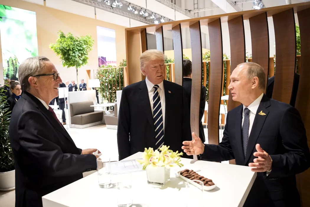 HANDOUT - US-American President Donald Trump (c) and Russian President Vladimir Putin (r) meet at the G20 Summit in Hamburg, Germany, 7 July 2017. Photo: Steffen Kugler/Bundespresseamt/dpa,Image: 679117280, License: Rights-managed, Restrictions: ***