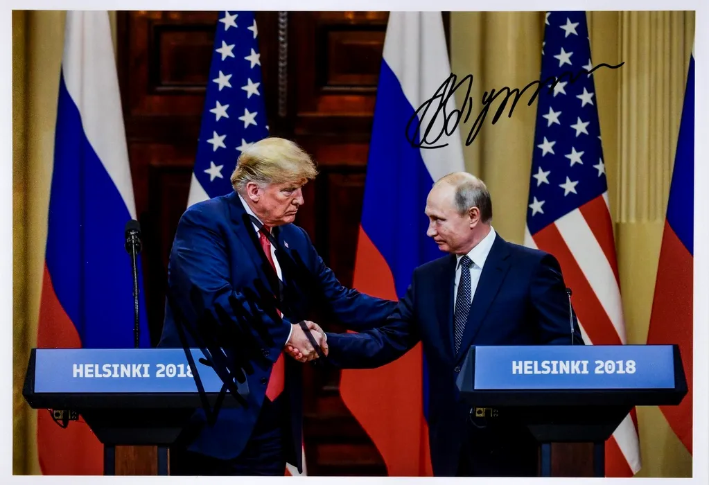 An image that is said to be the only jointly signed photo of US President Donald Trump and Russian President Vladimir Putin is up for sale. The pic, which shows the leaders shaking hands at the Helsinki summit in 2018, is signed by both and is for sale for $32,500 USD at US auction site, Moments In Time. The photo was reportedly first signed by Putin for a Russian government employee soon after the summit. Then, through an intermediary, the Russian sent it to a US Republican who asked Trump to sign it at an event last year. Now it is for sale on MomentsInTime.com.