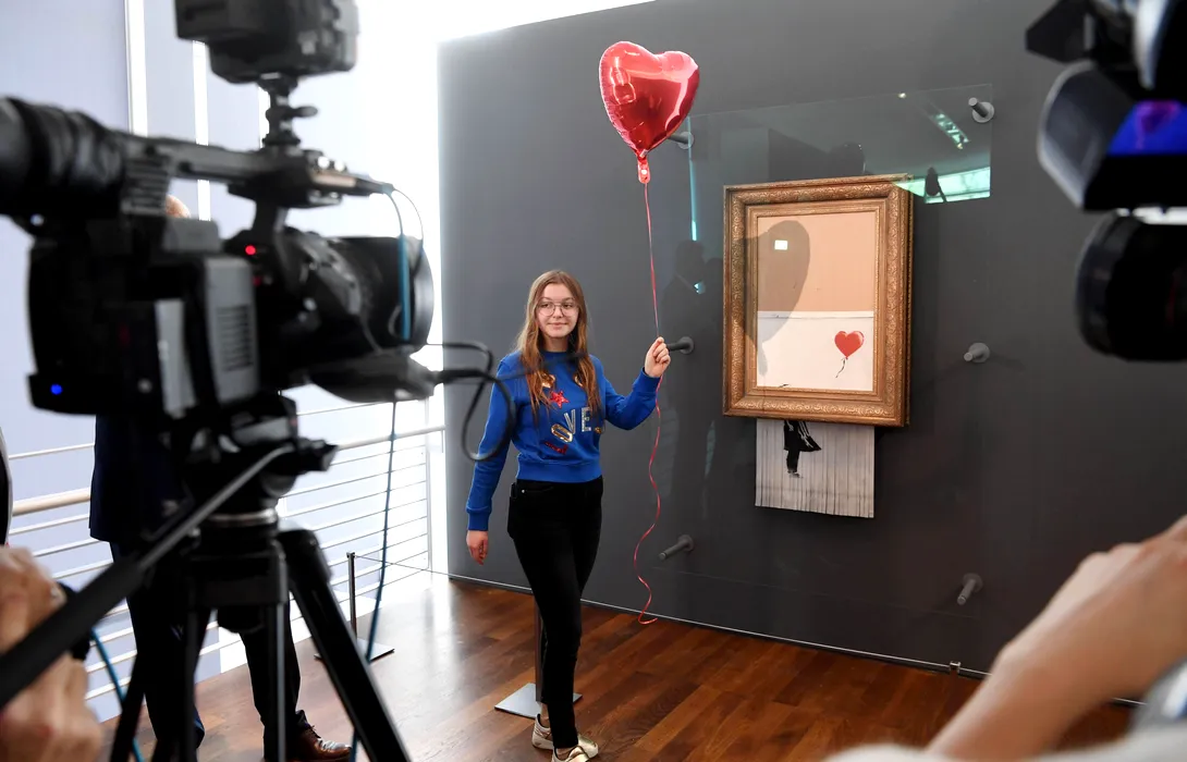Celebrul tablou al lui Banksy „Fata cu balon”, care S-A AUTODISTRUS în timpul unei licitații, din nou EXPUS publicului