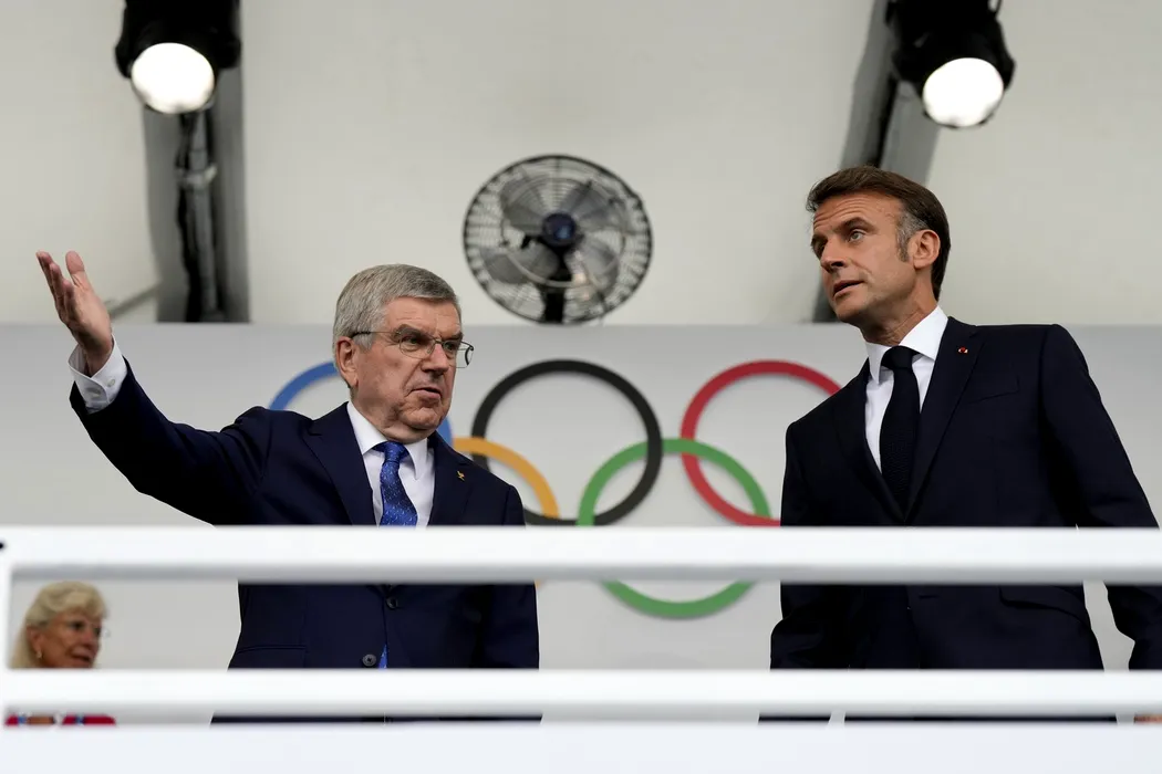 France President Emmanuel Macron, right, and IOC President Thomas Bach arrive for the opening ceremony of the 2024 Summer Olympics in Paris, France, Friday, July 26, 2024.,Image: 892703585, License: Rights-managed, Restrictions: This content is intended for editorial use only. For other uses, additional clearances may be required., Model Release: no, Pictured: Emmanuel Macron
