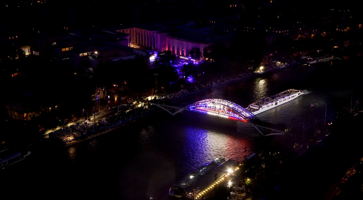 PARIS, July 26, 2024 -- A grab of a drone video released by the Olympic Broadcasting Services shows an aerial view of the France's delegation boat navigating under the Debilly footbridge lightened up with the French national colors during the opening ceremony of the Paris 2024 Olympic Games, in Paris, on July 26, 2024.,Image: 892810482, License: Rights-managed, Restrictions: , Model Release: no