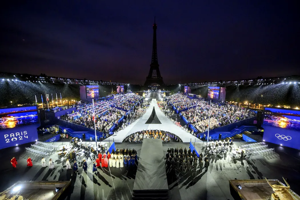 An overview of the Trocadero venue while the delegations arrives, in Paris, during the opening ceremony of the 2024 Summer Olympics, Friday, July 26, 2024.,Image: 892789599, License: Rights-managed, Restrictions: This content is intended for editorial use only. For other uses, additional clearances may be required.