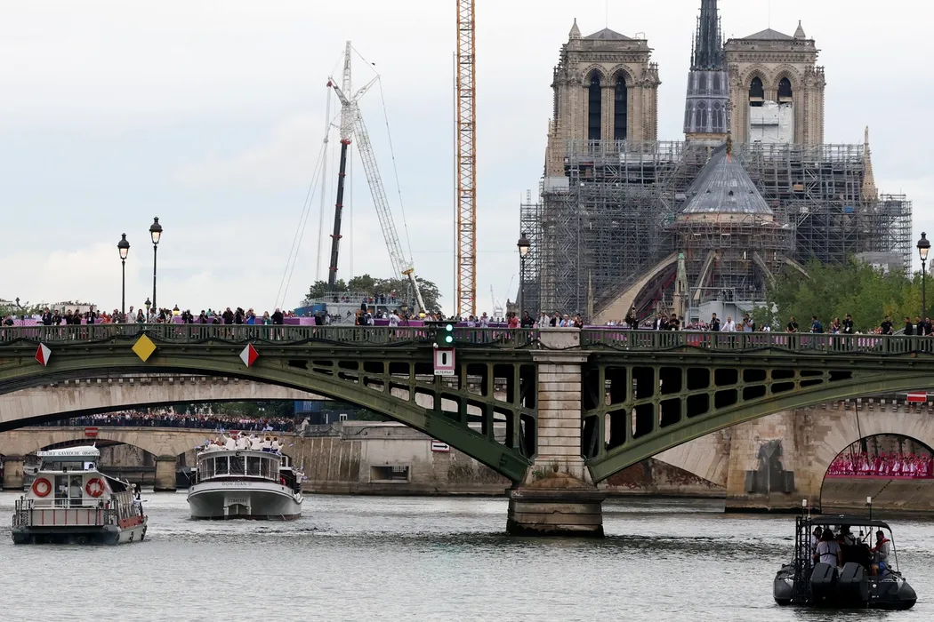 Athletes from Greece's delegation sail in a boat (2L) along the river Seine at the start of the opening ceremony of the Paris 2024 Olympic Games in Paris on July 26, 2024.,Image: 892705482, License: Rights-managed, Restrictions: , Model Release: no