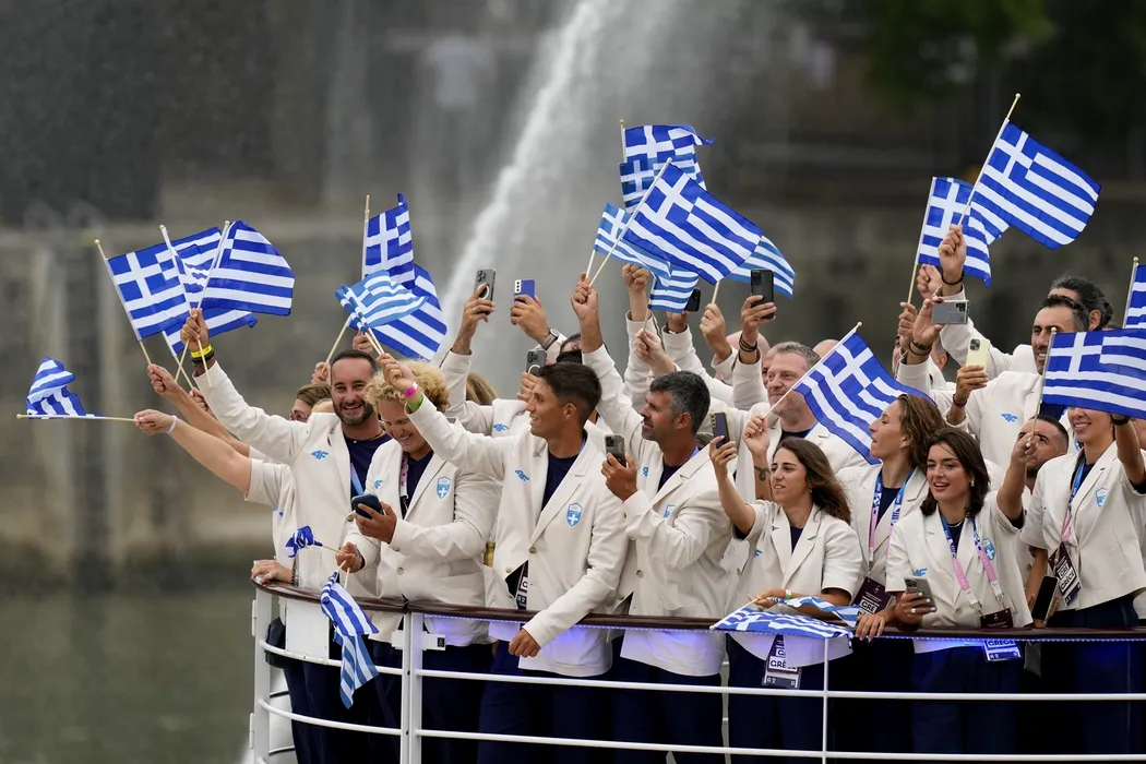 Team Greece moves along the Seine River in Paris, France, during the opening ceremony of the 2024 Summer Olympics, Friday, July 26, 2024.,Image: 892707640, License: Rights-managed, Restrictions: This content is intended for editorial use only. For other uses, additional clearances may be required., Model Release: no
