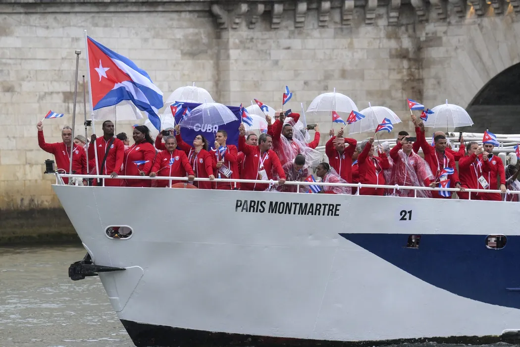 PARIS, FRANCE - JULY 26: Athletes from Cuba delegation sail in a boat along the river Seine as rain starts at the start of the opening ceremony of the Paris 2024 Olympic Games in Paris, France on July 26, 2024. Mehmet Murat Onel / Anadolu/ABACAPRESS.COM,Image: 892799156, License: Rights-managed, Restrictions: , Model Release: no