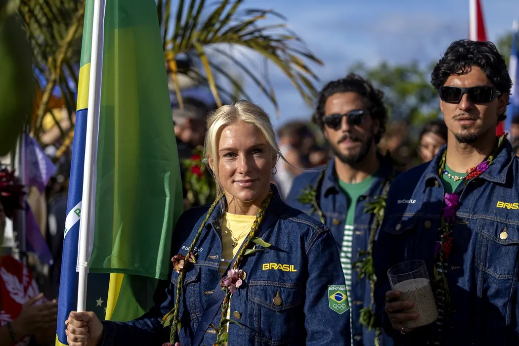 Tatiana Weston-Webb of Team Brazil walks with teammates during the opening ceremony of the 2024 Summer Olympics, Friday, July 26, 2024, in Teahupo'o, Tahiti.,Image: 892766046, License: Rights-managed, Restrictions: This content is intended for editorial use only. For other uses, additional clearances may be required.