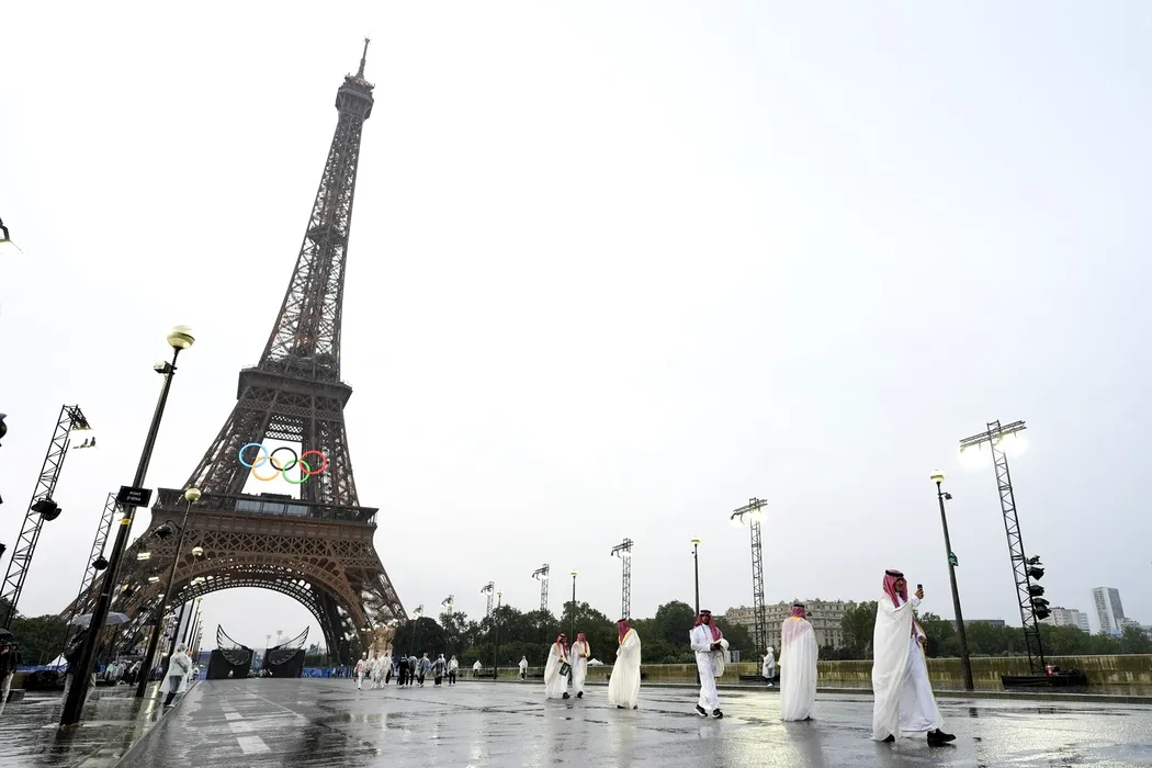 Saudi Arabia athletes walk across a bridge near the Eiffel Tower in Paris, France, during the opening ceremony of the 2024 Summer Olympics, Friday, July 26, 2024.,Image: 892721644, License: Rights-managed, Restrictions: This content is intended for editorial use only. For other uses, additional clearances may be required., Model Release: no