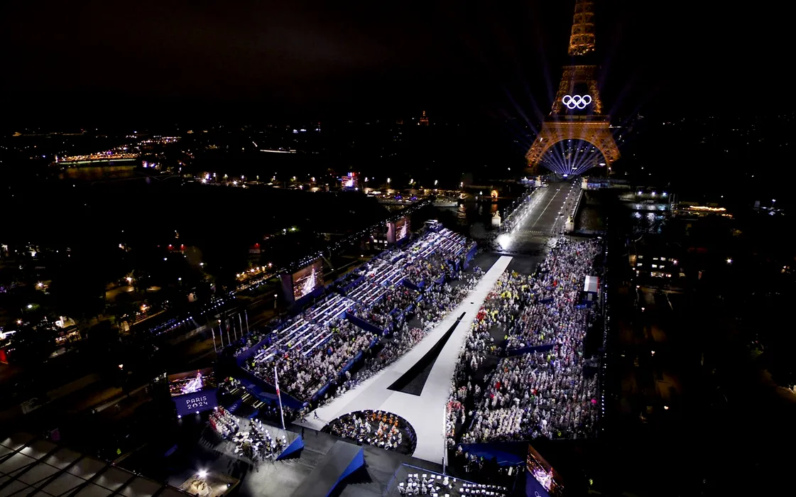 PARIS, July 26, 2024 -- A grab of a drone video released by the Olympic Broadcasting Services shows an aerial view of the Eiffel Tower lightened up with the Olympic Rings in front od the Trocadero during the opening ceremony of the Paris 2024 Olympic Games, in Paris, on July 26, 2024.,Image: 892810579, License: Rights-managed, Restrictions: , Model Release: no