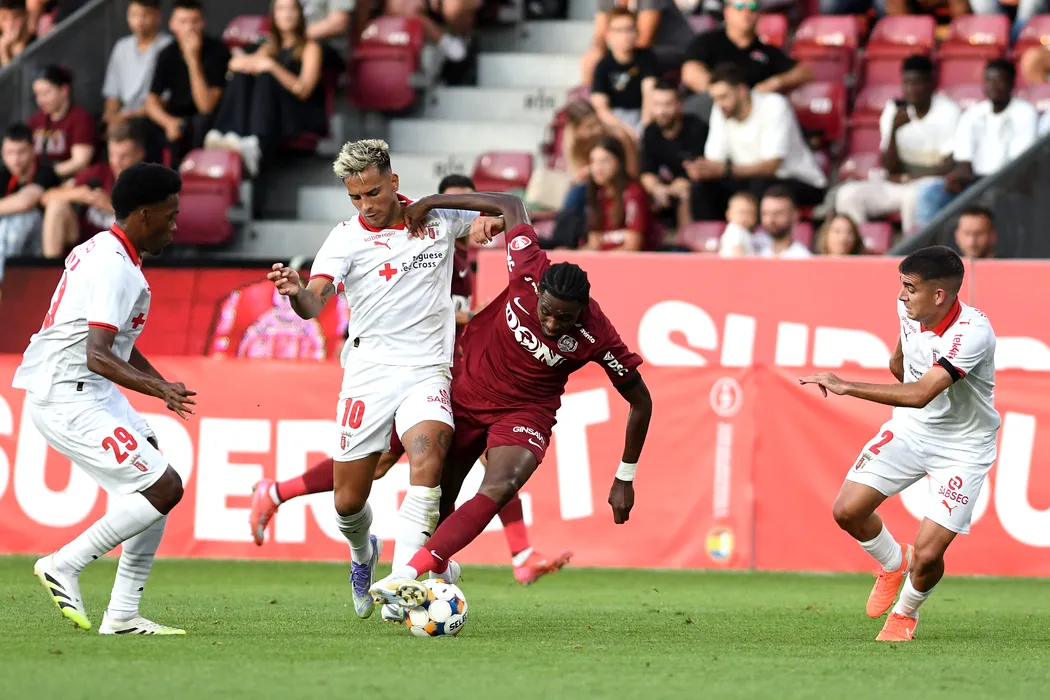 Beni Jean Luc Nkololo si Rodrigo Zalazar, Victor Gómez, Jean-Baptiste Gorby in meciul de fotbal dintre FC CFR 1907 Cluj si SC Braga, contand pentru UEFA League Turul 3 preliminar, desfasurat pe Stadionul Dr. Constantin Rădulescu din Cluj-Napoca, joi 7 august 2025. © FOTO: Flaviu Buboi/SPORT PICTURES