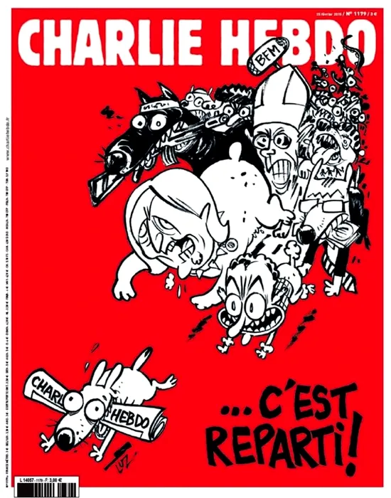 Charlie Hebdo a revenit pe piață. Cine este pe coperta numărului din 25 februarie