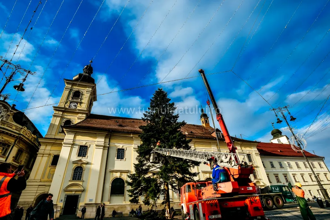 Cine a donat bradul de 19 metri, amplasat în centrul Sibiului pentru Târgul de Crăciun. Galerie FOTO