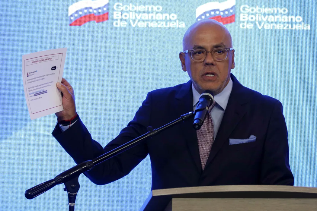 CARACAS, VENEZUELA - AUGUST 2: National Assembly President Jorge Rodriguez holds up what he says are invalid vote tally sheets during a press conference at the Miraflores presidential palace, in Caracas, Venezuela, Friday, Aug. 2, 2024. Pedro Rances Mattey / Anadolu/ABACAPRESS.COM