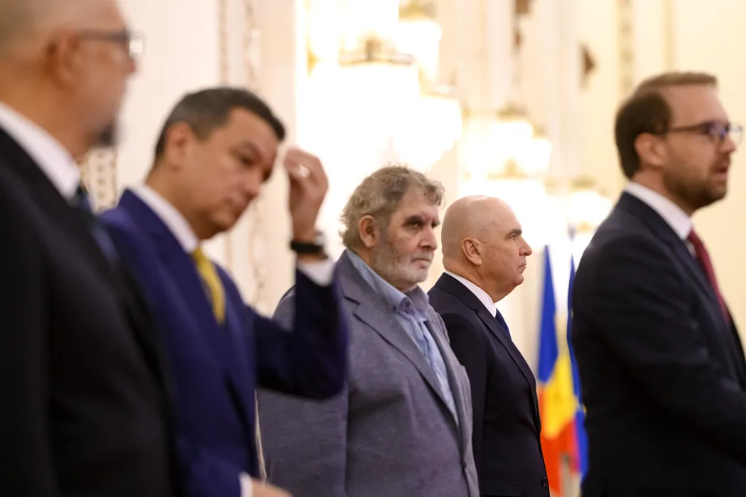 Sorin Grindeanu (al 2-lea din stanga) reactioneaza in timpul declaratiilor de sustinute de liderii coalitiei la finalul semnarii acordul politic intre PSD, PNL, USR, UDMR si Grupul Minoritatilor privind un nou guvern si un nou program de guvernare, la Palatul Parlamentului, luni, 23 iunie 2025, in Bucuresti. ALEXANDRU DOBRE / MEDIAFAX FOTO