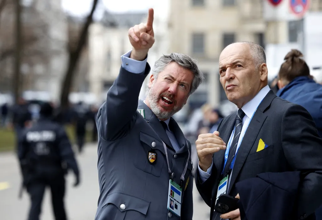 Benedikt Franke (stânga), directorul general al celei de-a 62-a Conferințe de Securitate de la München (MSC), discută cu omul de afaceri ucrainean Victor Pinchuk în fața Hotelului Bayerischer Hof | Foto - Profimedia Images