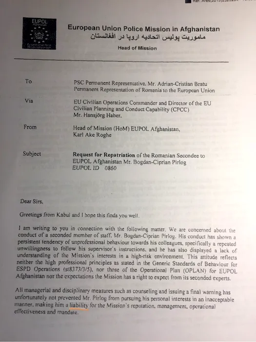 Comandantul Europol pentru Afganistan a trimis două scrisori statului român în care solicita retragerea magistratului Bogdan Pîrlog pentru că ar fi periclitat misiunea