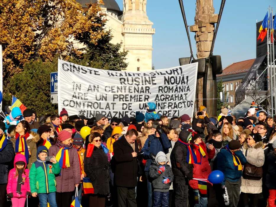 CINSTE înaintașilor! RUȘINE nouă! În an CENTENAR, România are un premier AGRAMAT controlat de UN INFRACTOR. Mesaje de PROTEST față de Jandarmerie și PSD, la defilarea de la Cluj
